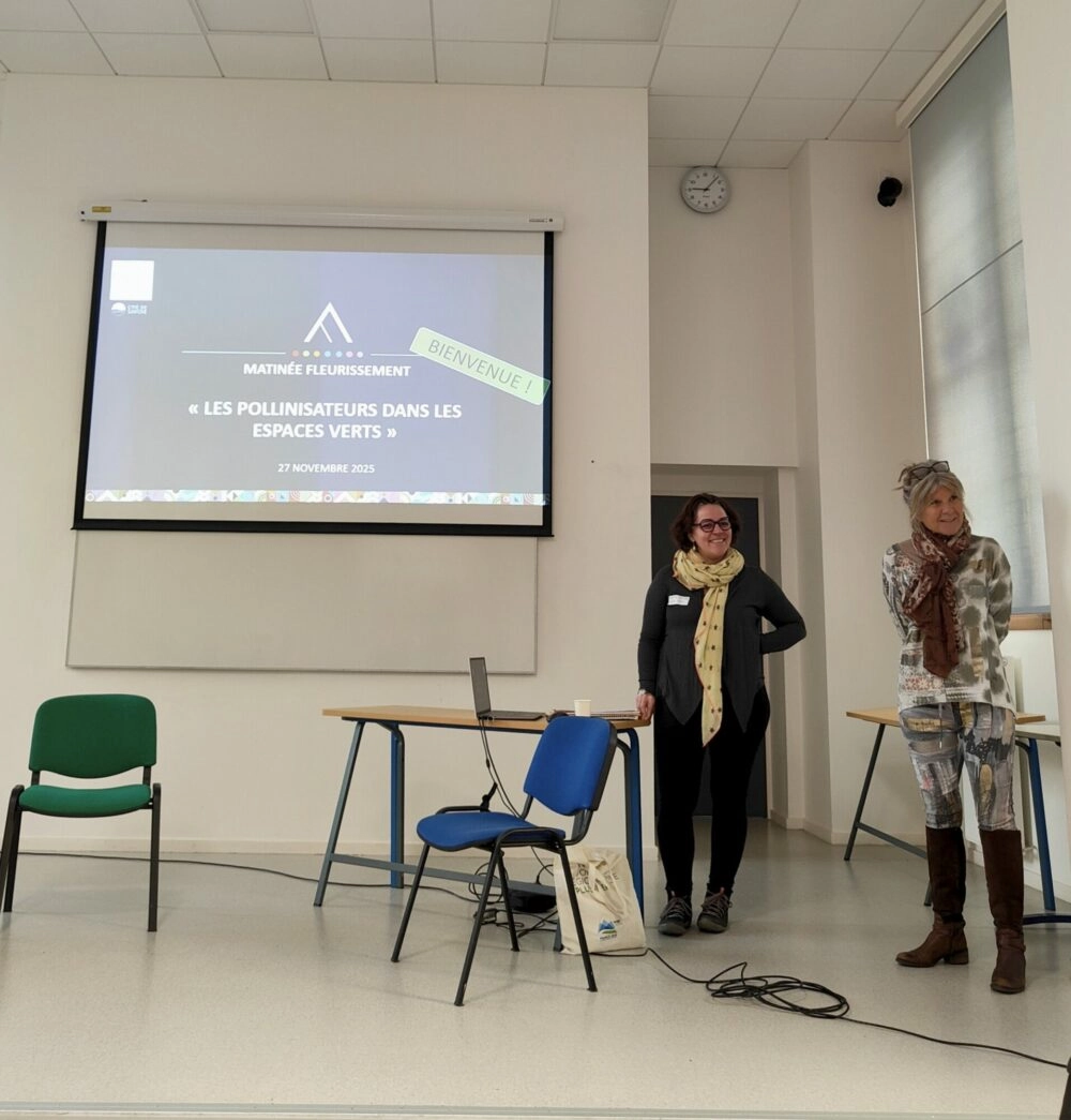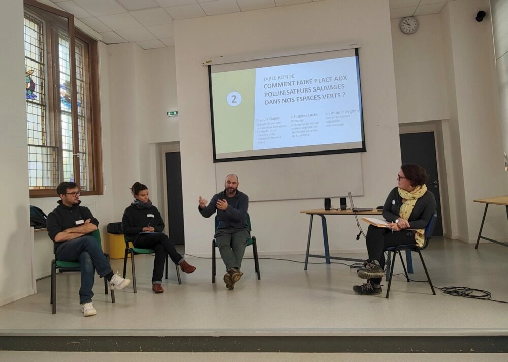 • Lucie Gager et hugues Lacks l’ont rejoint pour une table ronde afin de présenter les moyens pour mieux intégrer les pollinisateurs dans la gestion des espaces verts et évoquer les freins rencontrés par les collectivités savoyardes.